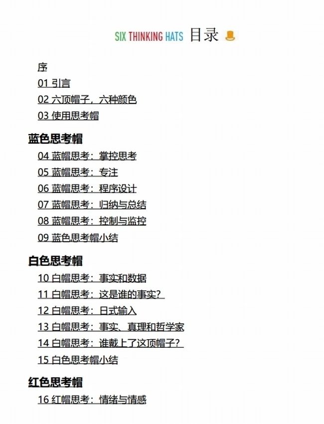 套装由《六顶思考帽》、《简化》和《细节》组成。 六顶帽子、六个维度,全球创新思维训练法开创者——爱德华·德博诺经典力作,是激发创造力实用的系统思考方法。 “六顶思考帽”所强调的是一个非常简单的概念,它只能允许思考者在同一时间内做一件事情。思考者要学会将逻辑与情感、创造与信息等区分开来。这一概念就是“六顶思考帽”的方法。戴上任意一顶帽子都代表着一种特定类型的思考方式。
